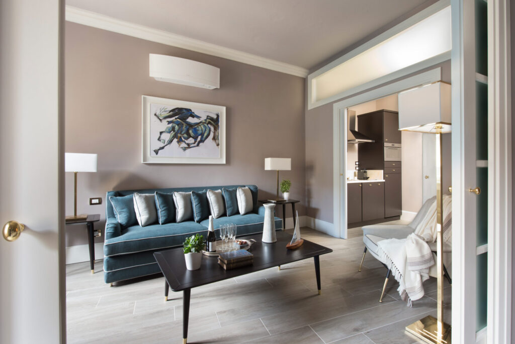 Overlooking Via Tornabuoni, it features a master bedroom with a king-size bed and a spacious bathroom, a living room that converts into a second bedroom, and a dining area with a fully equipped kitchen. The Alamanni Suite is the largest and most versatile in the collection, a true residence suitable for discerning couples and small family groups.